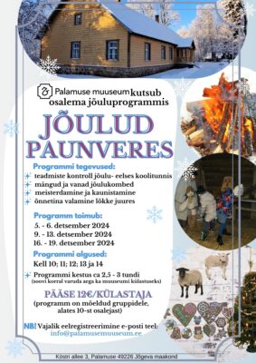 Pane tähele! Vajalik eelregistreerimine e-posti teel: info@palamusemuuseum.ee