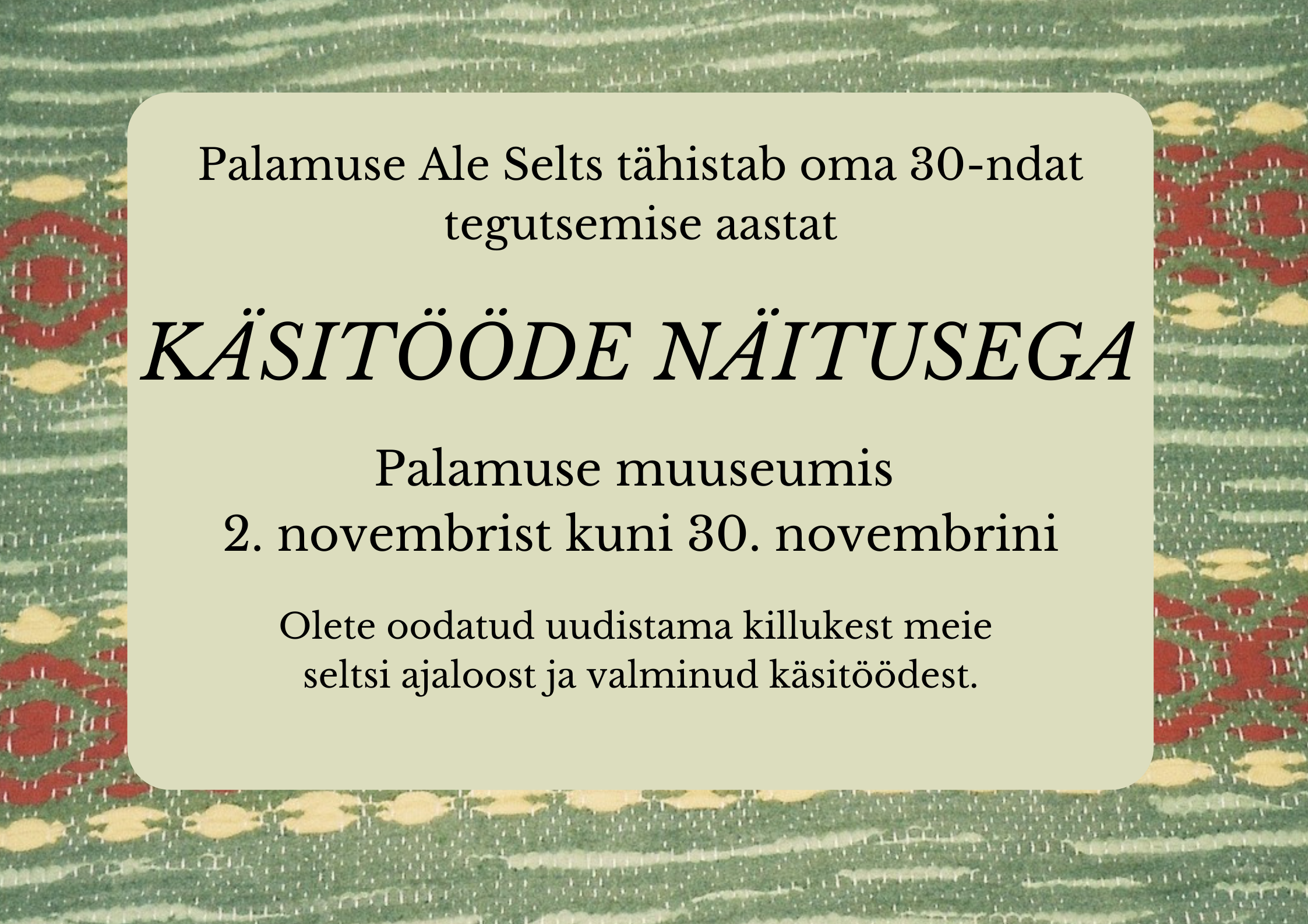 Tähistame koos Eesti Vabariigi 105. ja Palamuse kihelkonnakoolihoone 150. aastapäeva! Ootame teid pidusöögile Eestimaa(Heiki Vilep) Peipsi äärest Saaremaani, Läti piirist mereni, igast lapsest punapõsksest kuni suure pereni – kõik see kokku on me kodu, see on meie Eestimaa. kaardi pealt võib ära võtta, südamest ei kätte saa!